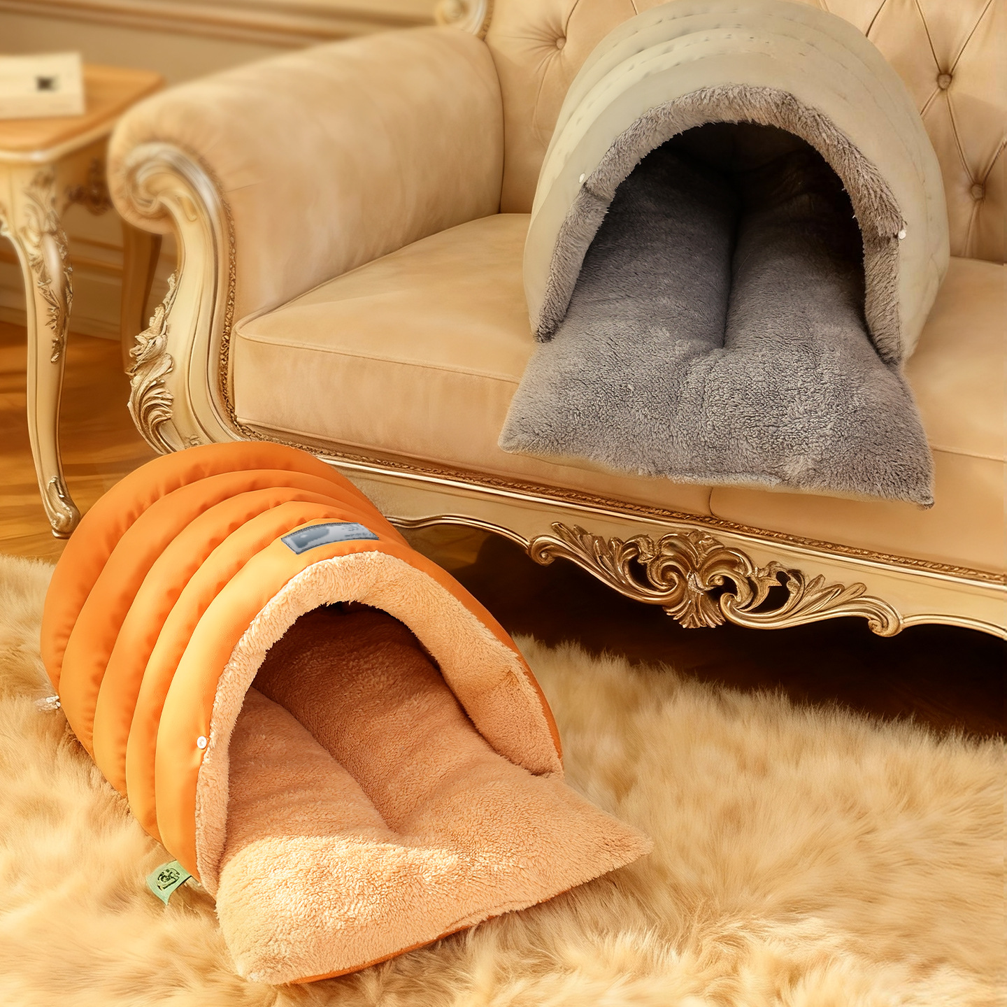 Introducing the All-Season Leather-Look Pet Sleeping Bag – your pet’s new favorite hideout for winter (and beyond)!